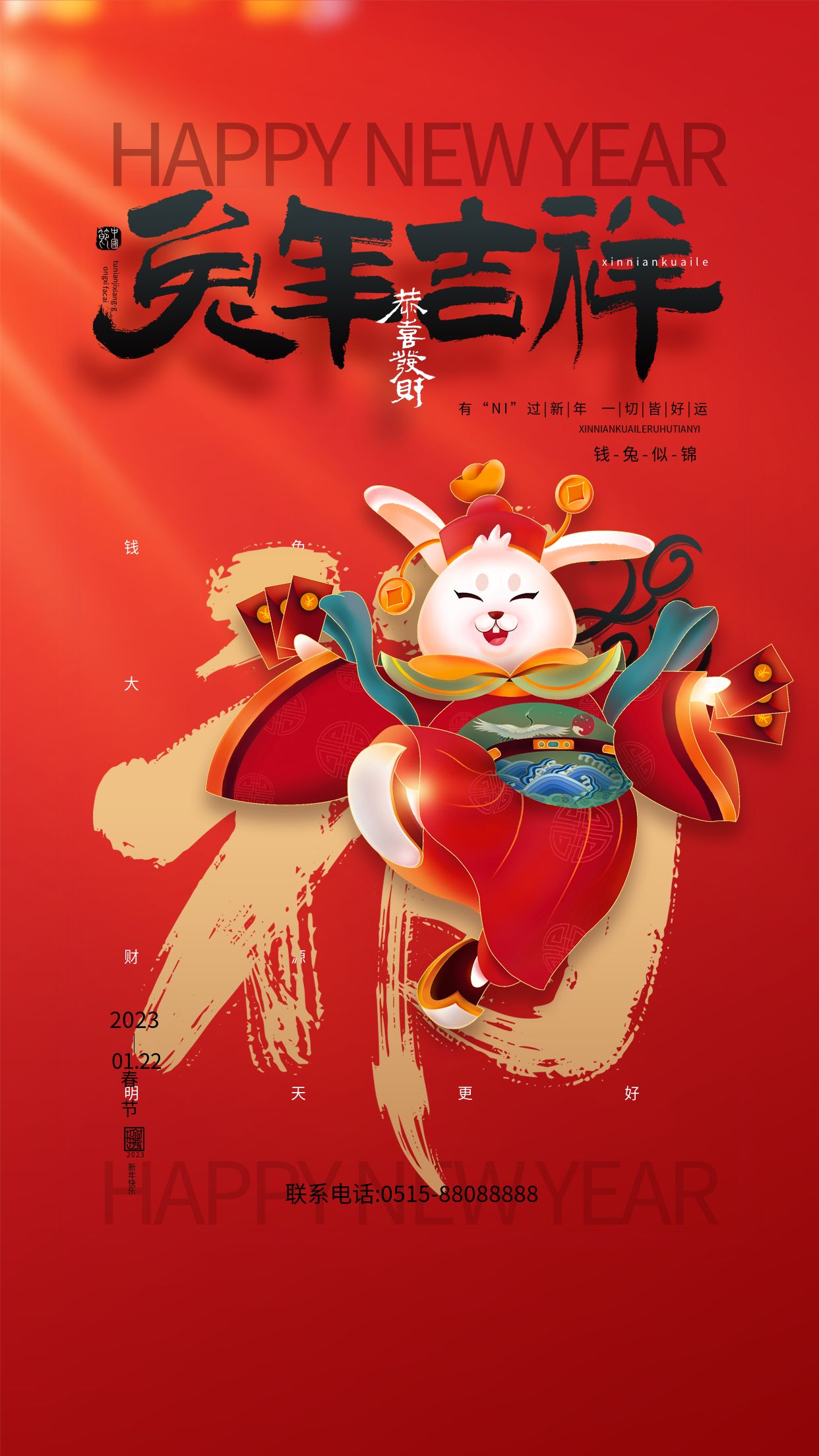 值此新春佳節(jié)到來之際,宏順建設(shè)給大家拜年了!恭祝大家身體健康、闔家歡樂!愿大家2023兔飛猛進(jìn)、共謀發(fā)展、共繪未來!
